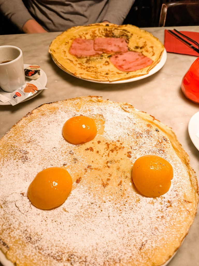 Eventually we got up and around, and decided to go eat pancakes. No kidding. Pancakes are a whole thing here. Of course, they are not the same as American pancakes, and seemed me to be pretty similar to a flat crepe. No complaints here. We got a savory one with ham and mushrooms, and a sweet one with peaches. Those look like egg yolks, but they are peach halves.