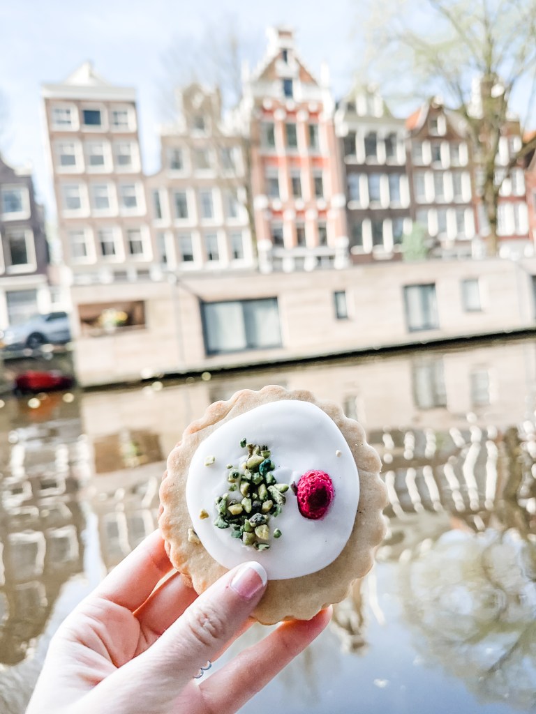 At that point it felt like time to break out the secret weapon: a raspberry and pistachio shortbread cookie with raspberry jam inside. This is what they have at the Saturday market in Amsterdam.