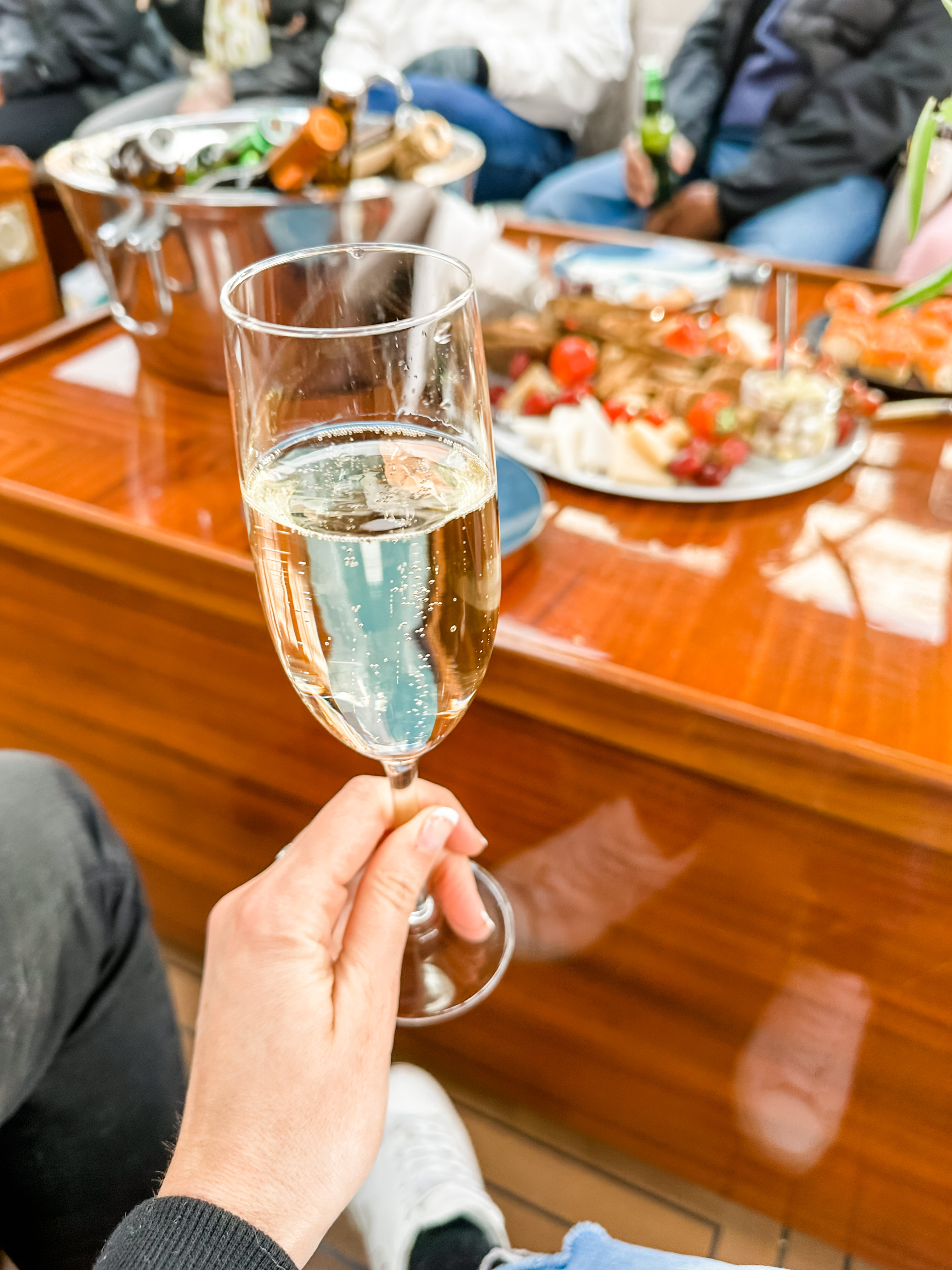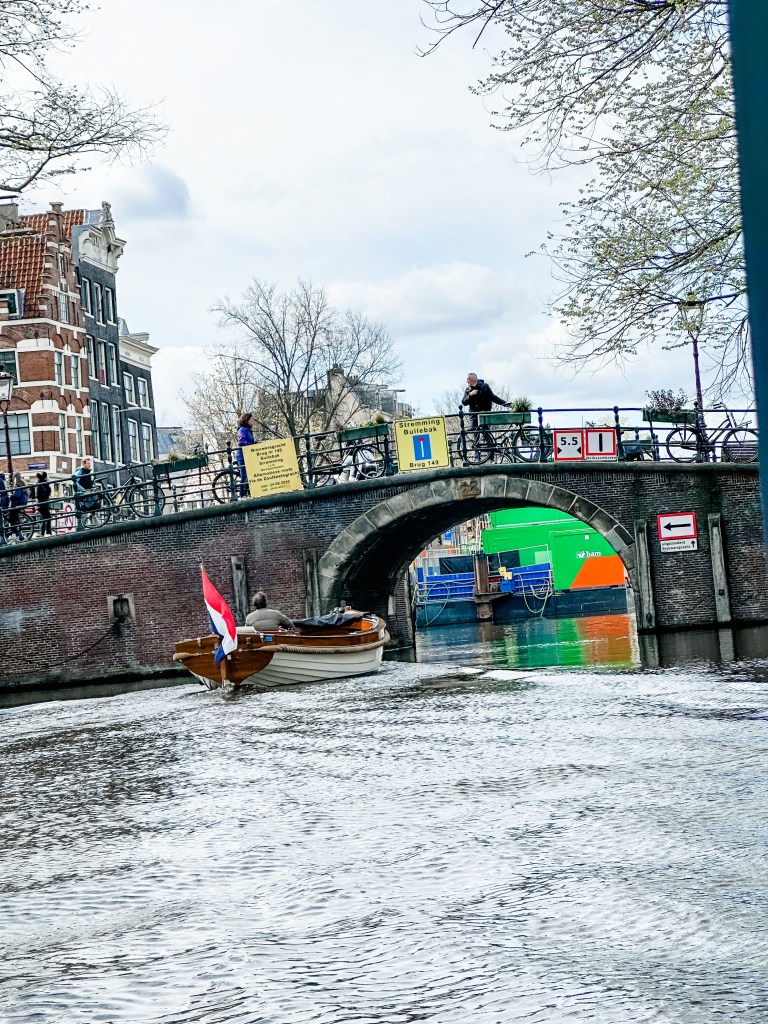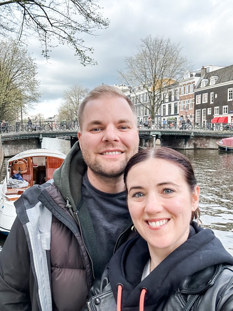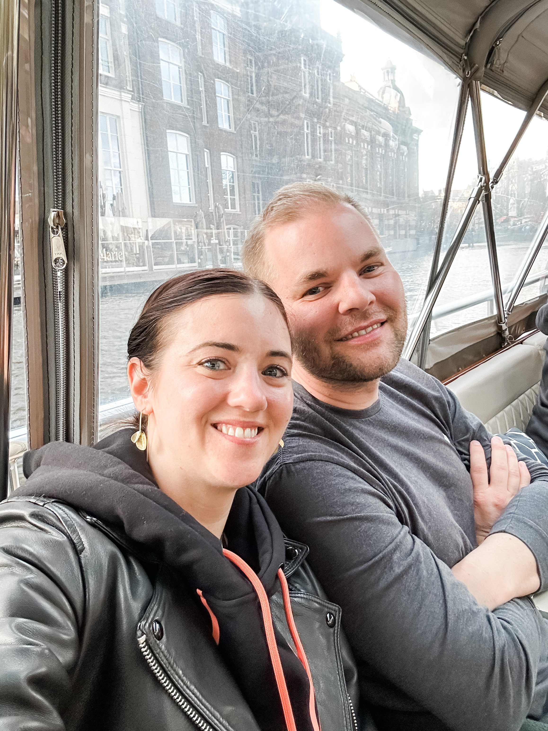We bundled up, then felt really silly when we showed up to find this gorgeous little boat that was both covered and heated, and filled with drinks and snacks. If I’d known that, I would have made my outfit a bit cuter. Oh well, I was super comfy, and my sweatshirt is one I bought in Amsterdam from a shop that sells clothing by local Amsterdam artists. Also, it has orange on it.