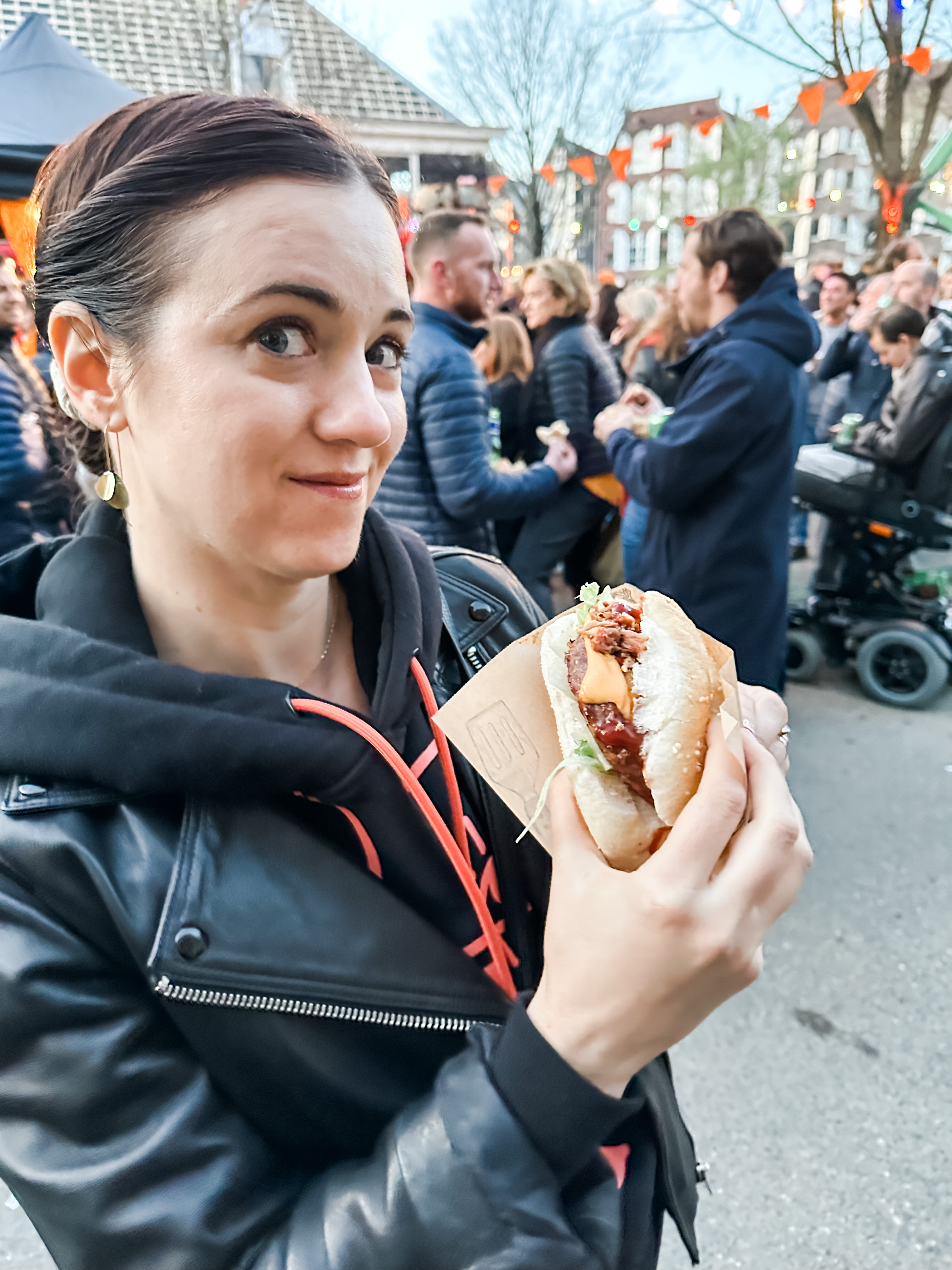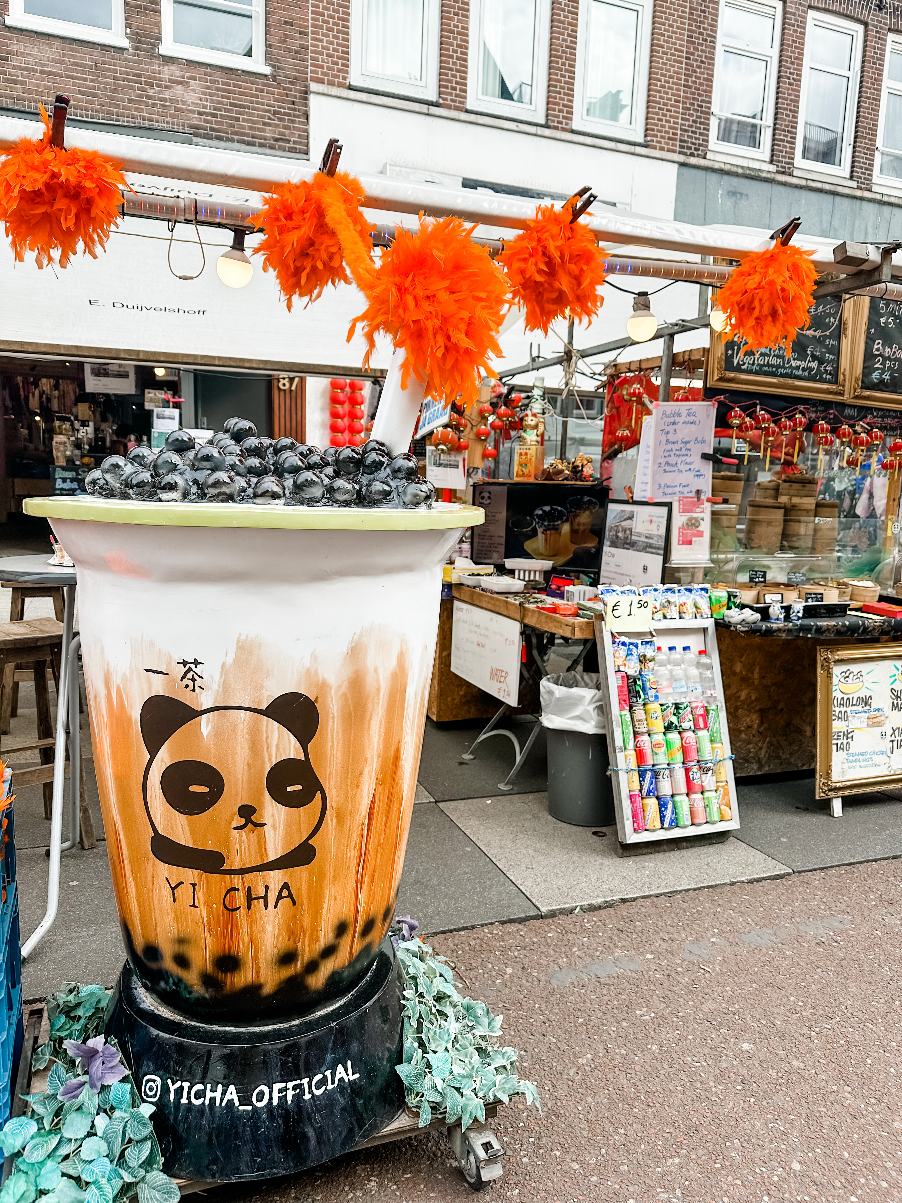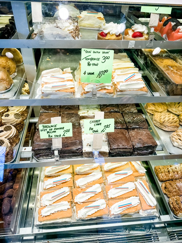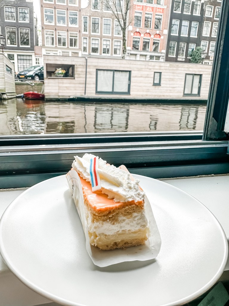 I noticed they were also selling the tompouce pastries, and they were on my list of must try food in the Netherlands. They are particularly special for King’s Day, when the top icing part becomes orange in celebration of the royal family. The shop owner was excited that I knew what they were, and gave me one with a flag on it.