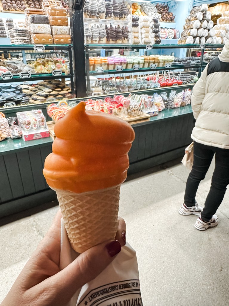 We got a dessert that looks like an ice cream cone, but is actually filled with meringue and coated in white chocolate. It was a bit sweet for me, but Jimmy loved it.