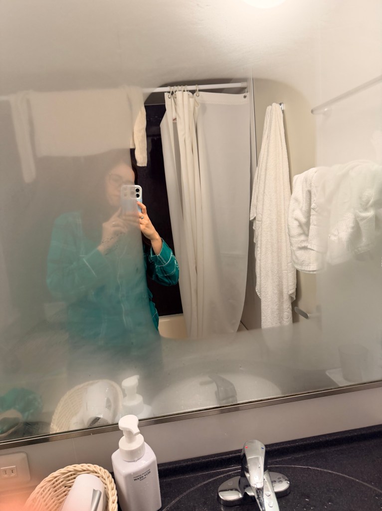 My favorite convenience at our hotel (aside from the amazing toilet which you will find everywhere in Japan) was the heated mirror in the bathroom. I emerged from my shower to find a totally fogged up mirror with the exception of a perfect rectangle which is the perfect size for doing makeup. Love it.