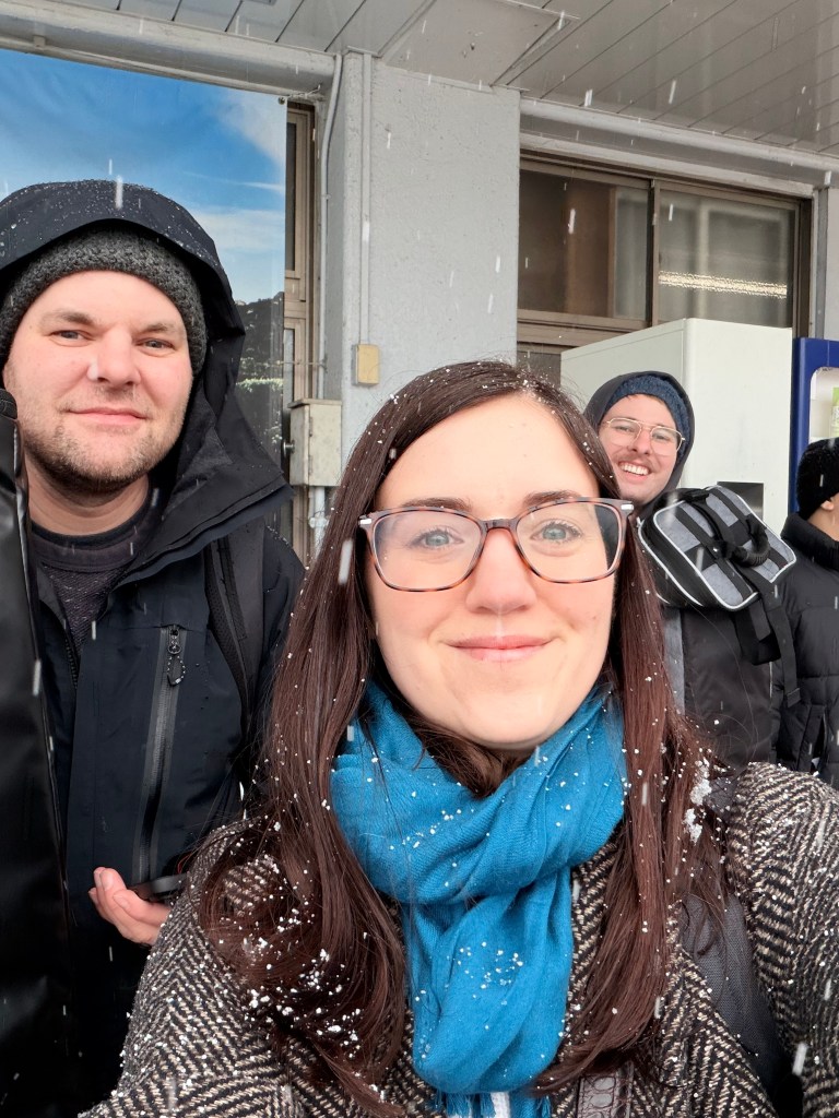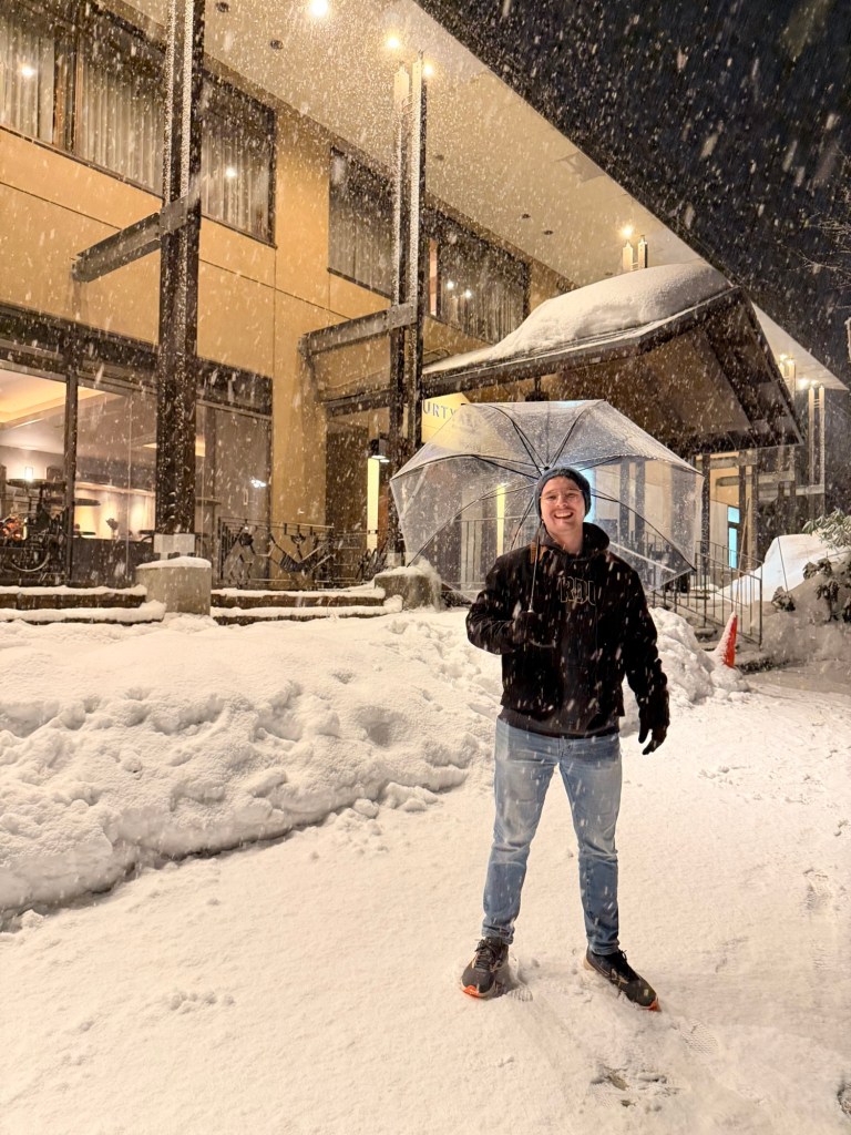 As we left the hotel we were offered umbrellas… because of snow? Jordan decided to accept one.