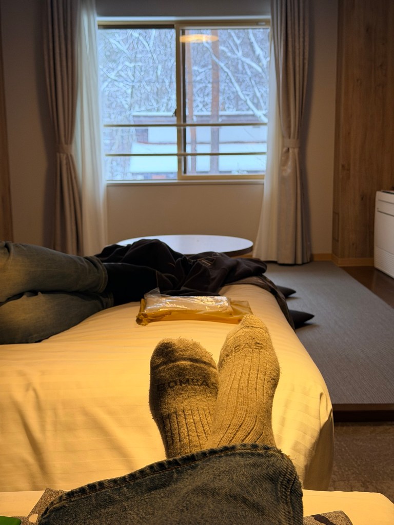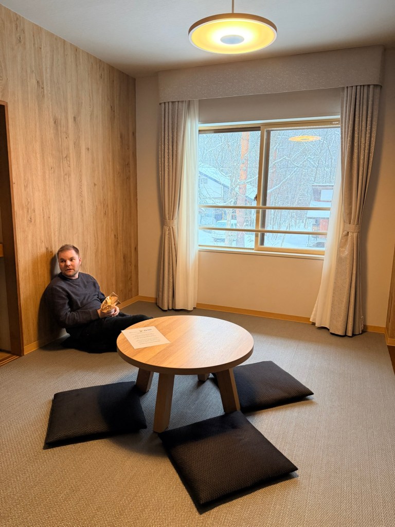 Here’s the room with the traditional Japanese eating area and view of the snow. We did have western style beds, although even western style beds are extremely firm in Japan by our standards.